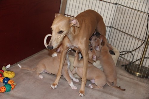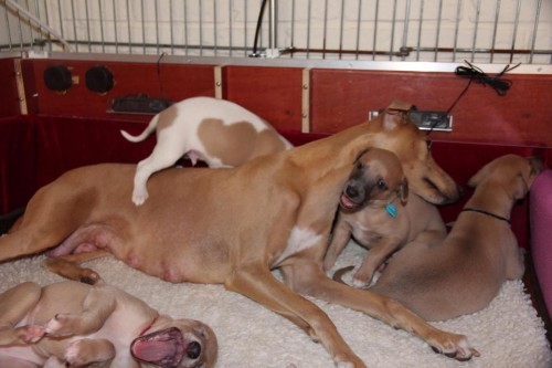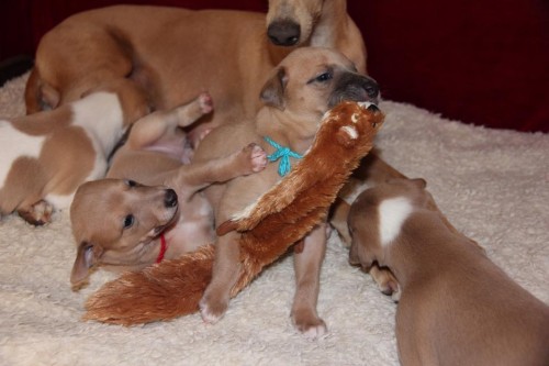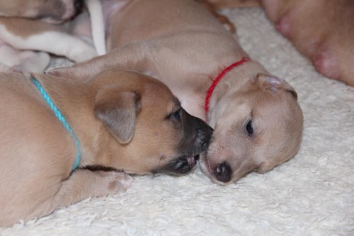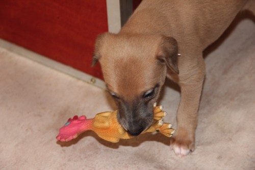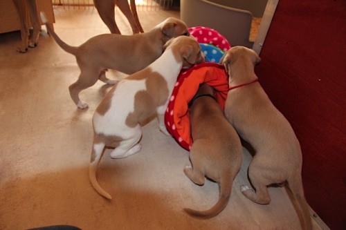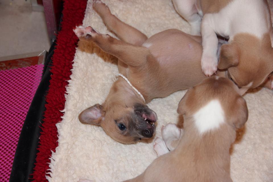 De tijd vliegt echt voorbij, afgelopen zondag waren de C-tjes alweer vier weken oud. Ze eten nu twee keer per dag pap, twee keer rauw vlees en een keer geweekte brokjes. Af en toe knabbelen ze al een beetje aan droge brokjes, om een beetje te wennen.