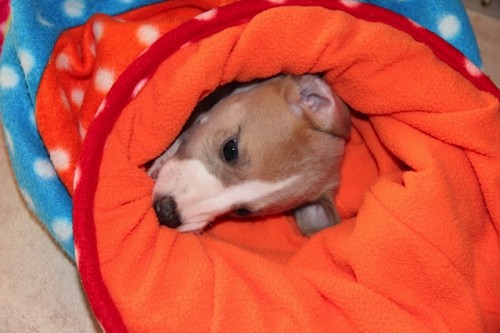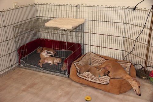 Vandaag is de werpkist verwissseld voor de bench en een mand. Zo leren de pups dat het best lekker slapen is in zo’n bench, voor het geval ze daar bij hun nieuwe eigenaren af en toe in moeten om te slapen. Wel hebben ze beschutting rondom, net als in de werpkist (iets wat we eigenlijk altijd aanraden in een bench als je die echt wilt gebruiken, want zo dicht bij de vloer is er altijd tocht).