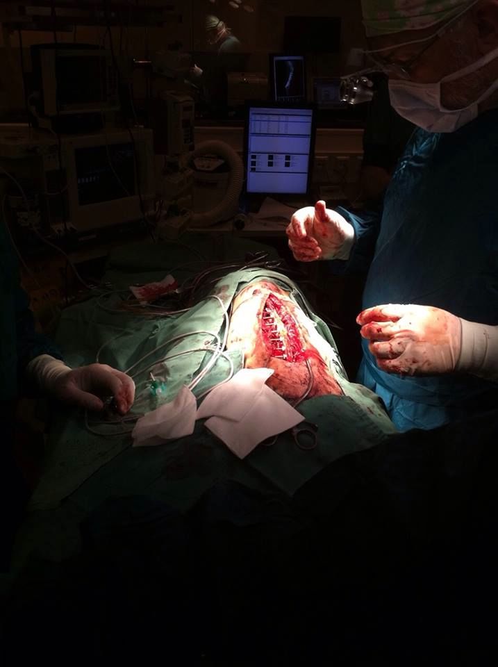 De rug werd vervolgend gehecht met drie lagen hechtingen. Excuus voor de bloederige beelden; ik hoop maar dat iedereen er net zo goed tegen kan als ik ;>)). De chirurg was meer dan tevreden met het eindresultaat, de operatie had niet voorspoediger kunnen lopen.