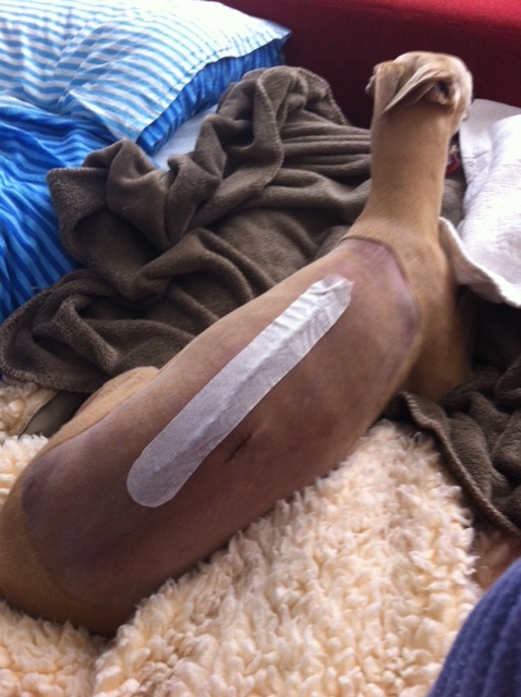 Hazel werd gelukkig na ruim een uur samen zoeken door Ronald gevonden; heel timide en onzeker, achter een hek in de verste hoek van het struingebied. Hinde lag met een verlamde achterhand bij de dierenarts, inmiddels in gezelschap van mijn moeder. De foto’s wezen uit dat een rugwervel van zijn plek was geraakt door de impact van de aanrijding. Er werd voor de volgende dag een afspraak voor ons gemaakt bij het Medisch Centrum voor Dieren in Amsterdam, bij de orthopeed / neurochirurg die drie jaar geleden ook Chloe had geopereerd aan haar geluxeerde schouder. Ik wilde Hinde die avond niet naar een kliniek brengen waar ze de nacht alleen zou moeten doorbrengen en dus kreeg ik haar mee naar huis, inclusief infuus. Maar dat is nog wel een handigheidje om goed te laten druppelen. Godzijdank sprong Annemarie in de auto en reed op die avond vanuit Brabant naar Den Helder, zodat ik er die nacht niet alleen voor stond met Hinde. Heerlijk gewoon, want Annemarie is niet alleen een heel dierbare vriendin in goede en slechte tijden, maar ook verpleegkundige en dus veel handiger met infusen dan ik.