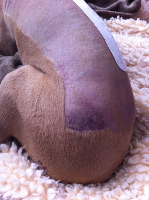 Zo ziet Hinde’s rug er nu uit; kaal met een lang litteken met pleister;