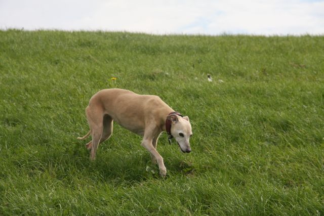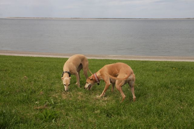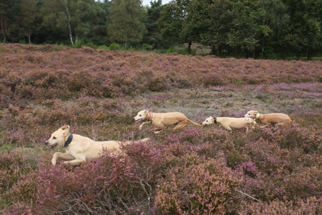 Vandaag ben ik dan degene, die zich afvraagt, of Hinde en Hazel ooit nog samen zullen kunnen rennen en ravotten. Dinsdagmiddag liep Ronald met ze in Mariendal, en halverwege de wandeling renden ze samen uit zicht. Ik weet bijna zeker dat ze naar het aangrenzende struingebied zijn gegaan, waar honden verboden zijn en waar de hazen zich dus graag ophouden. Ze zijn daarna op de een of andere manier overgestoken richting het bos en de duinen bij Duinoord; Hinde werd daar aangereden en Hazel maakte zich overstuur uit de voeten. Ze liet zich af en toe zien midden op de weg, maar liet zich door niemand pakken. Toen ik het hoorde ben ik net als Ronald gaan zoeken naar Hazel, terwijl Hinde door de dierenambulance naar onze dierenarts werd vervoerd. We waren zo bang dat Hazel in al haar paniek eenzelfde lot was beschoren als Hinde, dat we besloten dat zij eerst moest worden gevonden, voor het donker werd. Maar wat is het verdrietig als je daardoor je gewonde hondje niet zelf kunt begeleiden naar de dierenarts…..