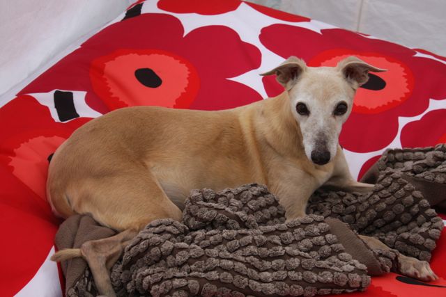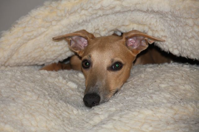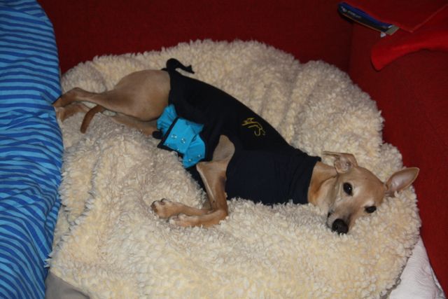 Eenmaal thuis gekomen installeerden we Hinde op haar binnenstebuiten gedraaide cave naast mijn matras, in de woonkamer. Ze moet nu zes weken rust houden en wanneer ze aangeeft naar buiten te willen mag ik haar alleen de tuin in vervoeren. Ze heeft een catheter die haar blaas in gaat. Daar past een injectiespuitje op, waarmee ik de urine kan onttrekken aan haar blaas. Wanneer ze onrustig wordt is dat het eerste dat ik doe. We hebben opnieuw een lastige nacht achter de rug, want de Methadon en Tramadol die Hinde waren toegediend speelden haar parten. Periodes van rust en stilte werden vaak afgewisseld door janken en piepen en onrustig hijgend overeind willen springen.