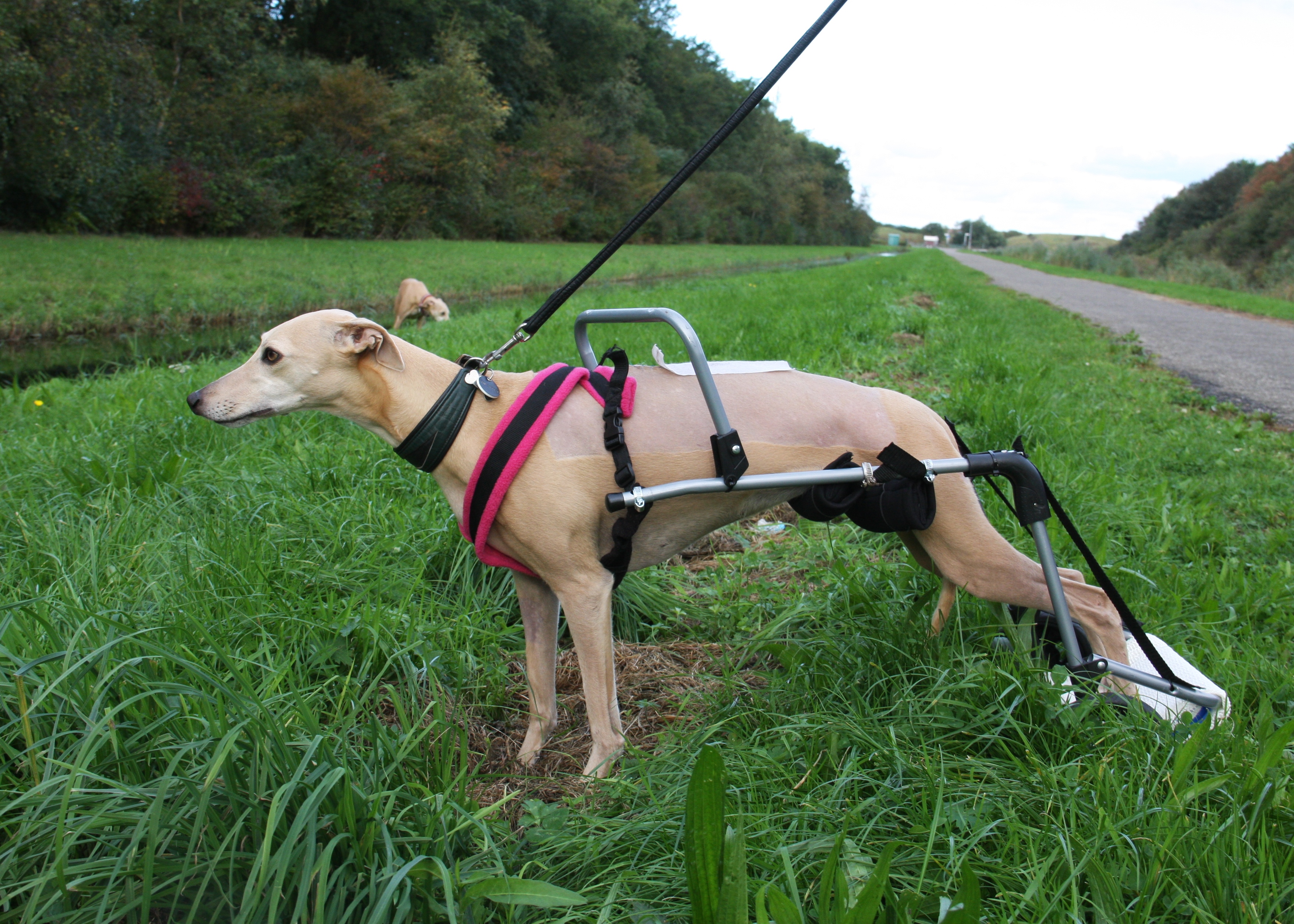 We hadden vandaag ook een afspraak bij onze holistische dierenarts in Heemskerk. Anderhalf uur heeft zij aan Hinde besteed; met o.a. osteopathie en acupunctuur. En zij zag dat Hinde best al het een en ander kan. De komende tijd ga ik twee keer in de week heen, om Hinde te laten behandelen. We hebben het beweegschema doorgesproken; Hinde moet heel veel rust hebben, maar omdat ze bij wijze van spreken haar nek breekt om mee te mogen met de anderen, gaat ze twee keer per dag mee naar onze wandelplekjes in de natuur; daar mag ze dan 50 meter lopen, een keer met de Walkabout en een keer met de Hindmobiel. Ze geniet zo in het gras, en gaat dan graag zelf eens zitten plassen, terwijl ik haar in evenwicht houd.