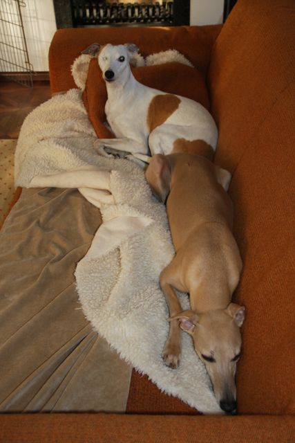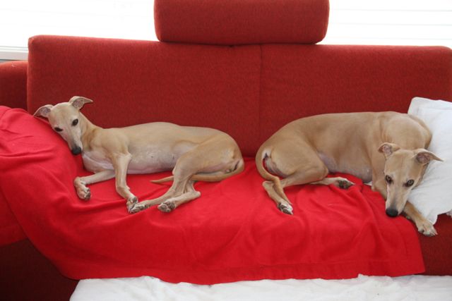 Zondag waren mijn mam en ik bij Marc en Annalies gaan lunchen, die op de hondjes van Wim pasten. Hinde ligt hier gezellig op de bank bij Jansje.