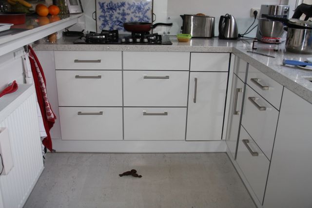 Een dingetje gaat nog niet helemaal goed….. vlak na een goede wandeling vind je dan zo maar een cadeautje in de keuken. Of soms gaat Hinde plotseling zitten persen in de woonkamer. En dan prijs ik haar maar helemaal de hemel in, want ik wil niet dat ze zich bezwaard voelt. Als dit zo blijft…. jammer dan. Na alles wat we hebben doorgemaakt raap ik deze drollen met heel veel liefde op ;>))