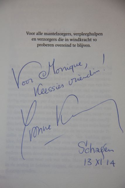 Het Mantelzorgcentrum waar ik stage loop organiseerde vorige week de Dag van de Mantelzorg. Yvonne Kroonenberg heeft een boek volgeschreven over mantelzorgers en kwam bij ons in Schagen een keiharde en toch heel gevoelige lezing geven. We hebben genoten! We zaten gezellig naast elkaar tijdens het avondeten (want jullie houden toch allebei van honden en paarden ;>))). Tijdens de pauze werd een signeersessie gehouden en ondertussen heb ik samen met Kees het centrum van Schagen onveilig gemaakt. Kees heeft daar op zijn eigen manier de hondenkrant gesigneerd ;>))