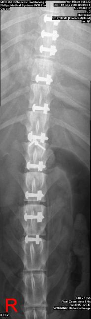 Dit is een foto van de ruggengraat, van boven gezien. Je ziet hier duidelijk de tien schroeven zitten, die de kunststof platen langs haar ruggengraat vasthouden. Ik heb er niet naar gevraagd in Amsterdam, maar links boven vind ik de aanzet van de ribben wat rommelig, volgens mij is daar door de aanrijding van alles beschadigd geraakt. De linkerrib ter hoogte van de tweede schroef is duidelijk gebroken. Het verklaart waarom haar ribben aan de linkerkant heel wijd uit stonden en zij de eerste vier weken echt niet op haar linkerzijde wilde liggen.