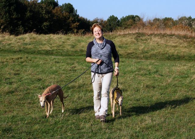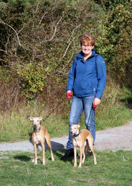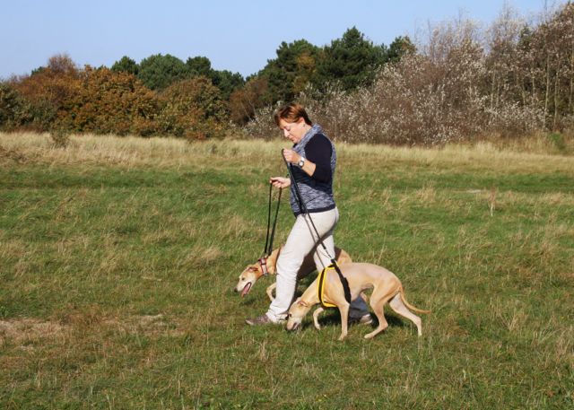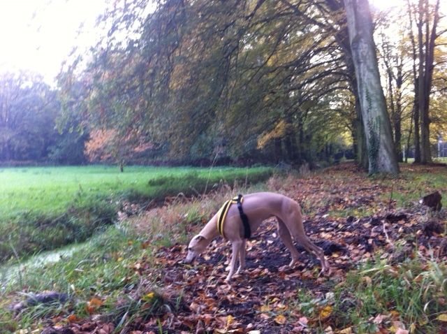 Hazel aan de uitloopriem; sinds Hinde’s aanrijding laten we haar nog wel los, maar zeker niet op onbekend terrein. Overigens weten we nu zo goed als zeker wat Hazel en Hinde naar de duinen heeft gelokt; er graast sinds kort een schaapskudde, die zich verplaatst onder de hoede van een herder. Hazel stond de laatste tijd zo intensief te snuiven in de lucht als we op het Hengstenpad en in Mariendal liepen…. het was de nieuwe en opwindende geur van deze voor haar onbekende dieren…..