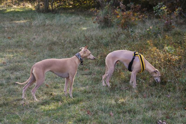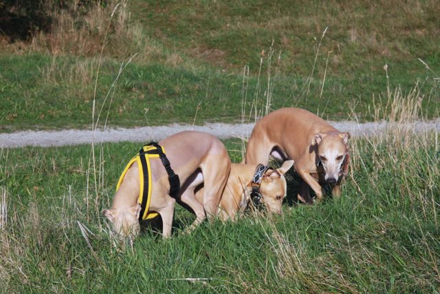 Dit is wat Hinde presteerde toen ze Megan en Aprille in de verte zag, nadat Hazel er al heen was gerend. De opstart bestaat uit een plasje doen; tegenwoordig doet ze dat soms lopend;