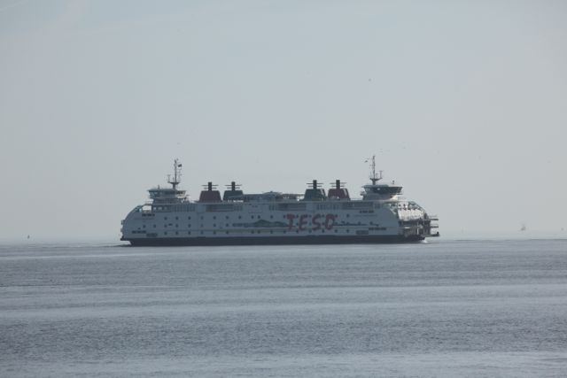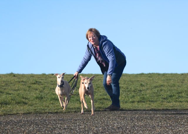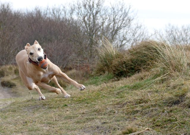 De volgende dag stond – natuurlijk – Texel op het program. Voor we de boot op reden lieten we de hondjes nog even plassen op de zeedijk. Nou, dat hebben we geweten….. ooit schreef ik het blog “gehufter in de Slufter” (toen Hinde als 2-jarige haar eerste haas ving, en 11 jarige Chloe tijdens die jachtpartij over de kop sloeg en haar schouder uit de kom had, waarna een zware operatie moest volgen). Het blog van vandaag had dan ook heel goed “gekloot bij de Texelse boot” kunnen heten. Hazel rook namelijk konijn aan de verre overkant, bij het KIM, waar de Nederlandse marineofficieren worden opgeleid. Ze vloog zo van de dijk alle straten over, met Hinde in haar kielzog. Wij kregen zo’n beetje een halve hartverknettering…..maar het is godzijdank goed afgelopen, en nadat we ze hadden onderschept waren we nog net op tijd om de boot op te gaan ;>)))