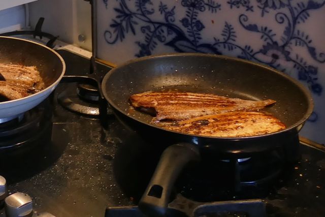 En de sliptongetjes gleden de roomboter in. Vers gehaald op de visafslag van Den Oever….. bij wijze van spreken zo vanuit het water in de pan!