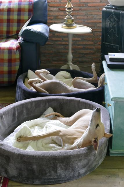 Ik gebruik de caravan als uitvalsbasis voor afspraken die ik in het oosten, midden en zuiden van het land heb. Zo whipten we bijvoorbeeld na een vergadering in het zuiden ook spontaan nog even aan in Geldrop, op ziekenbezoek bij Annemarie, waar de keuken altijd de fijnste plek is voor de residentie whippets en hun gasten.