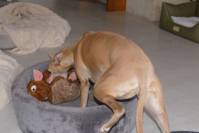 En Hinde vierde thuis haar frustraties bot op haar dikke speelgoedrat. Maar…… een week later liepen Hazel en Hinde per ongeluk tegen een haas aan in het lange gras, waarna een live coursing ontstond. Ze kwamen op het smalle dijkje waar we liepen recht op mij af gerend, de haas met vlak erachter Hinde en daarachter Hazel. En het was Hinde die het arme dier te pakken kreeg….. RIP mijnheer de haas ;>(.