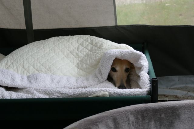 Het enige waar ze van balen is dat de caves thuis moeten blijven. Want zelfs met warm weer liggen ze er graag in. Op de camping is het maar behelpen met hun “oude” slaapzakjes……
