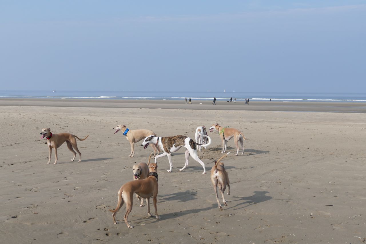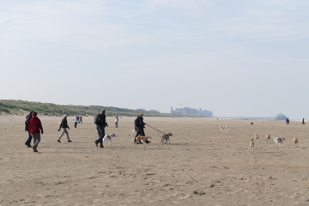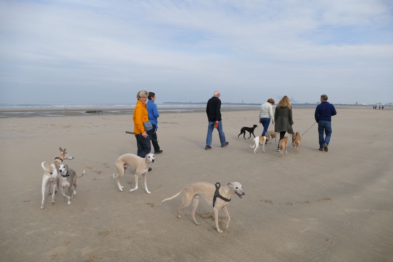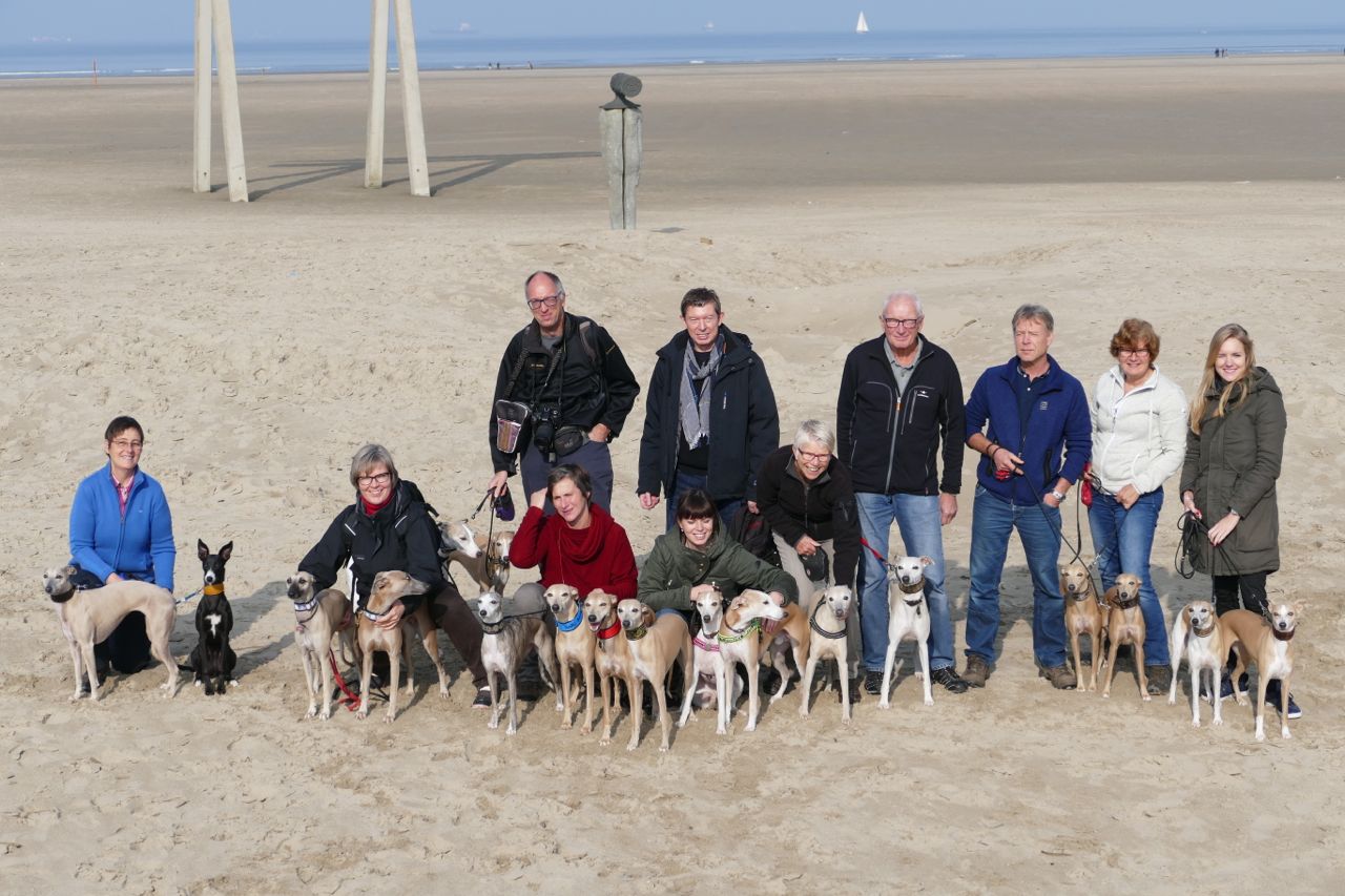 We liepen met 14 mensen en 20 whippets het zonovergoten strand op. Zalig weer was het, met veel zon en weinig wind.