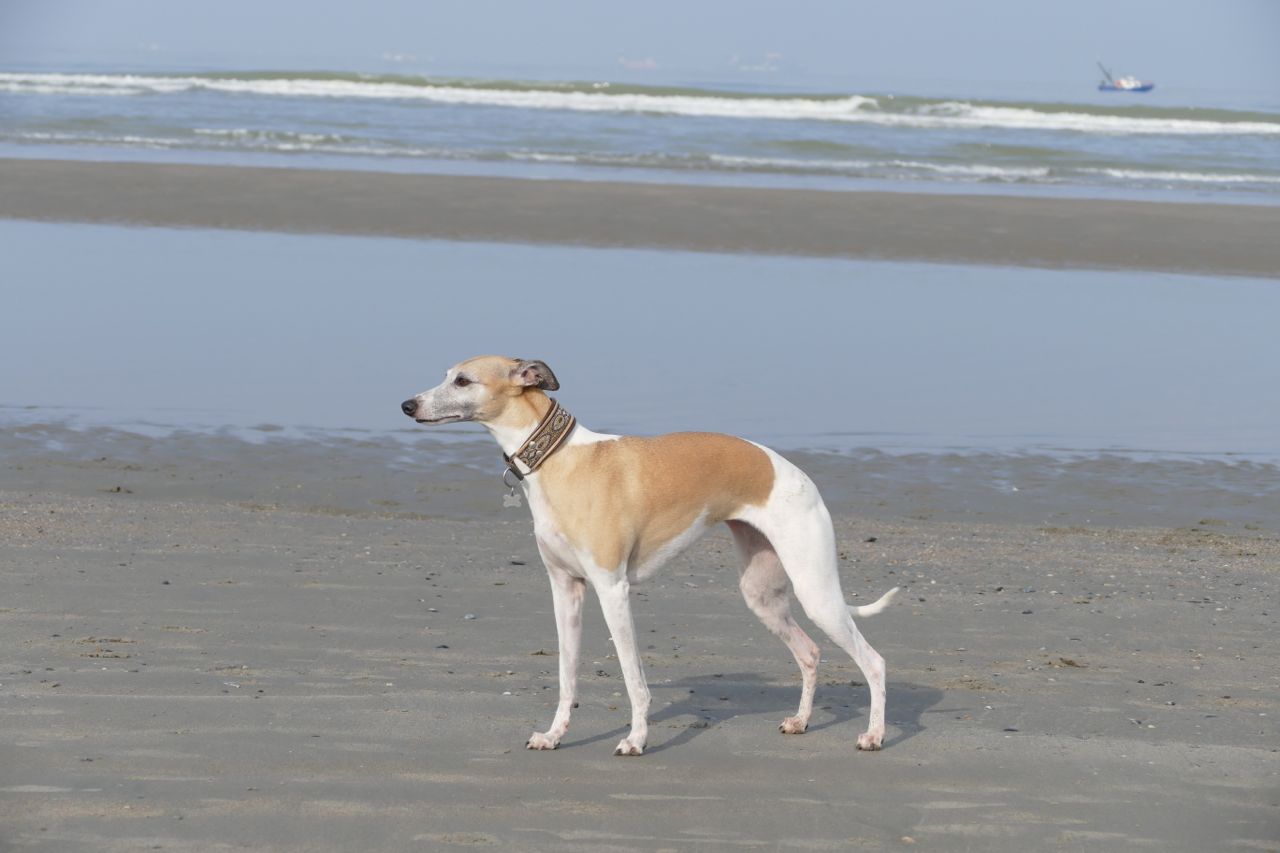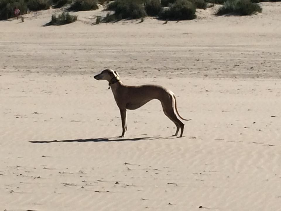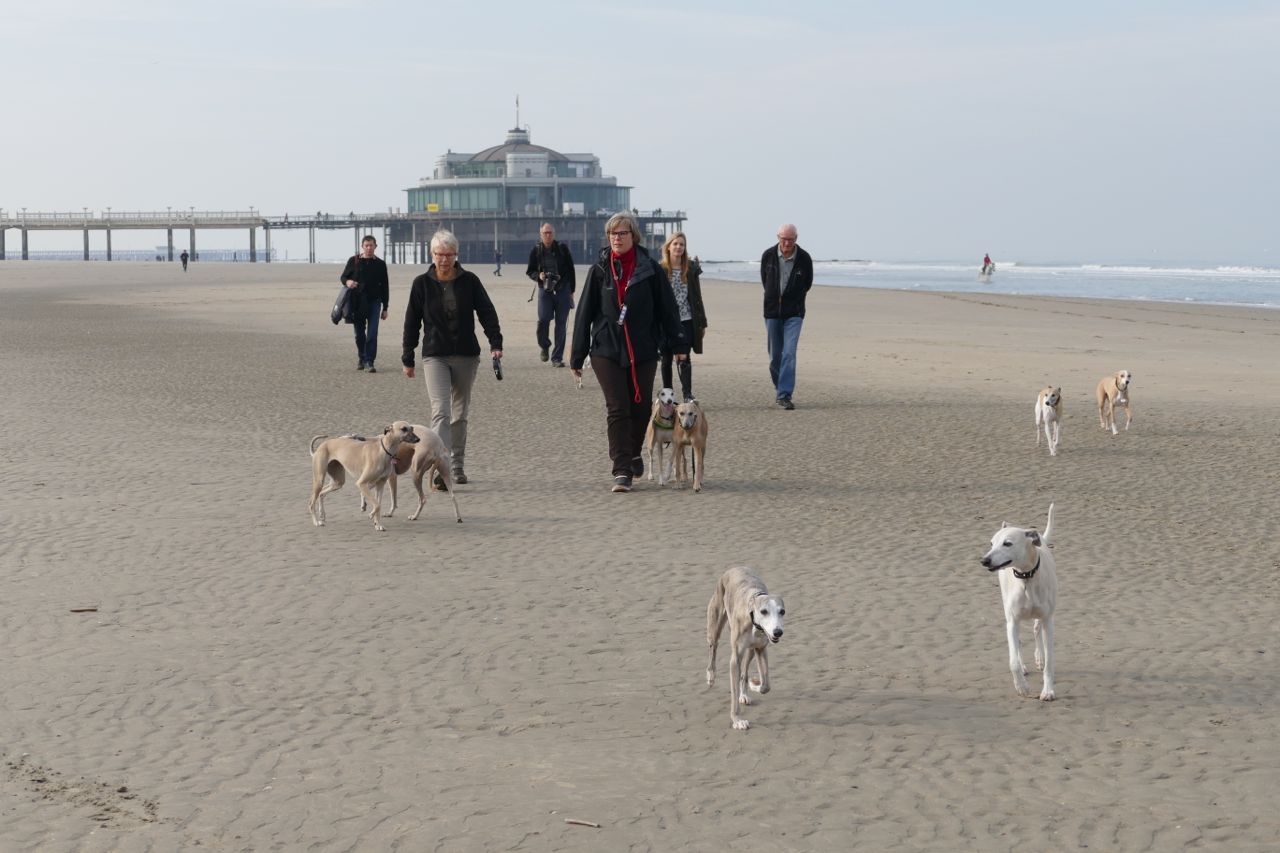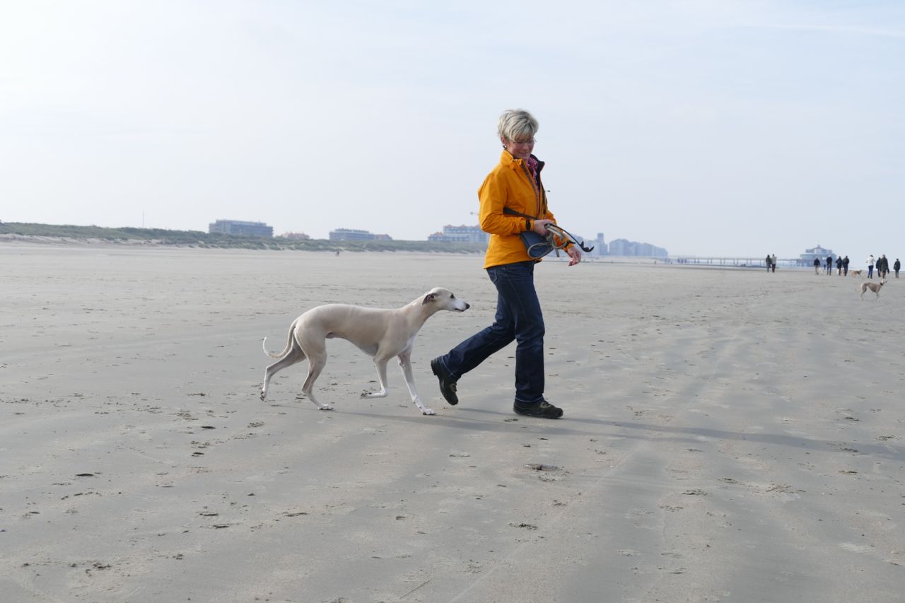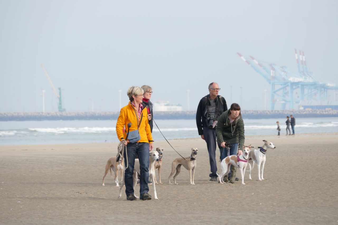 We liepen met 14 mensen en 20 whippets het zonovergoten strand op. Zalig weer was het, met veel zon en weinig wind.