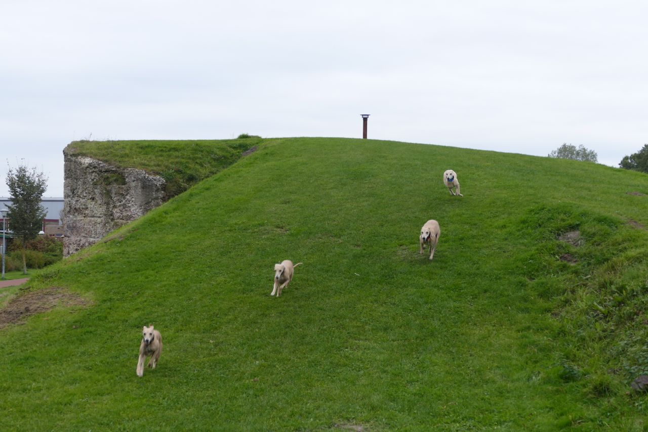Met Marianne en Megan en Aprille heb ik een paar wandelingen gemaakt in Den Helder, van een uur of twee. Hier komen de dames tijdens de Liniewandeling langs de forten van Den Helder van een van de bunkers af gescheurd.