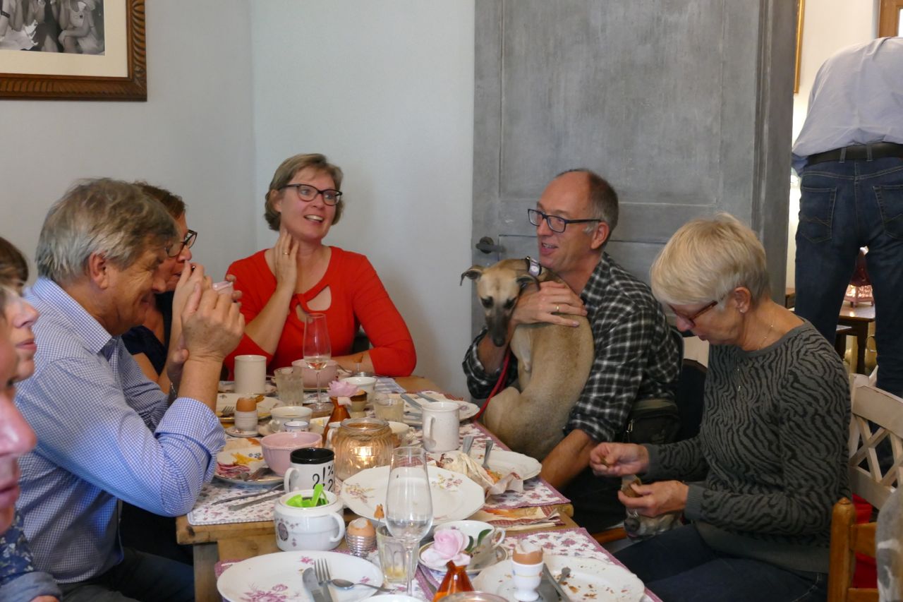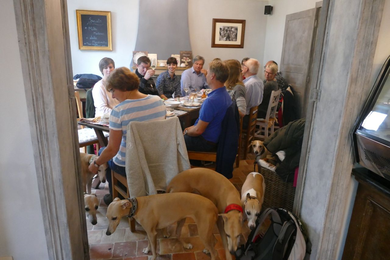 Evelien en Virginie hadden het briljante idee om ons whippet vakantieclubje uit te nodigen voor een gezellig weekend samen; de zaterdag bij Evelien en de zondag bij Virginie. Wij gaan regelmatig met elkaar op vakantie, voornamelijk naar Zwitserland, maar het was er in 2015 niet van gekomen, door van alles….. verhuizingen, nieuwe banen, gezondheidsperikelen, hele oude hondjes etc. Het weekend begon met een korte wandeling naar Taart en Koffiehuis Groot Geluk, voor een brunch.