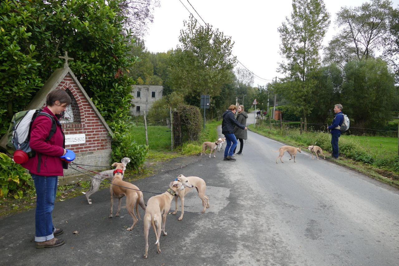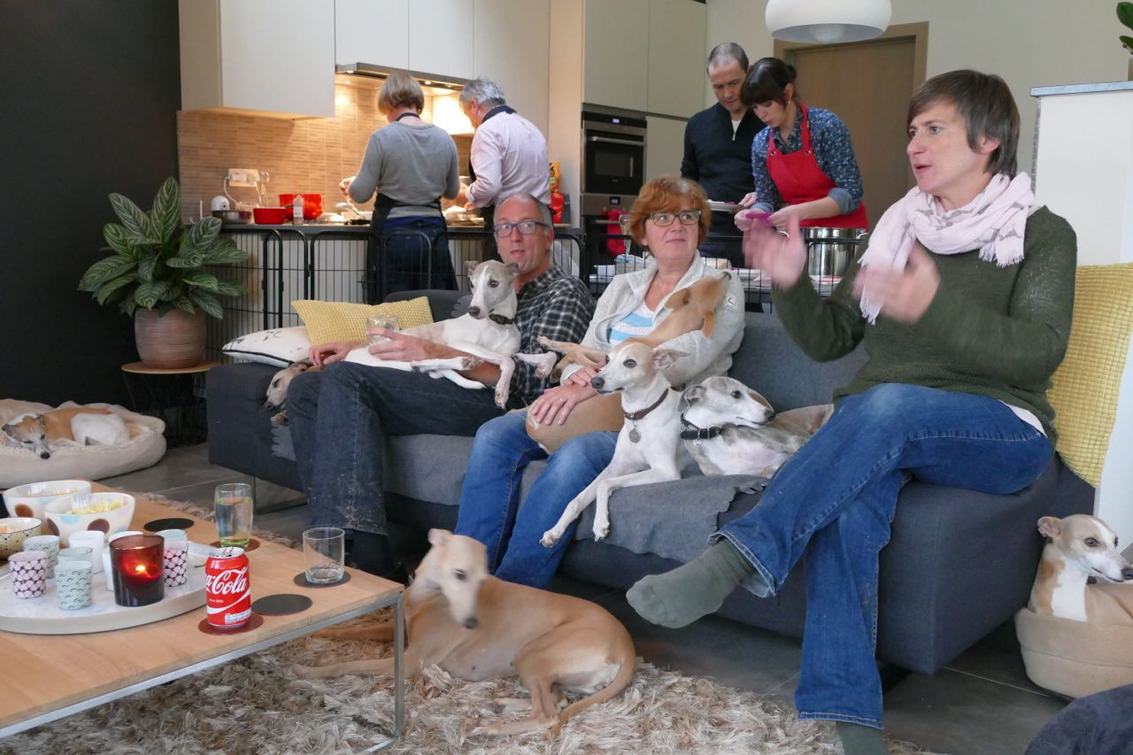 Daar streken we neer met 14 mensen en 16 whippets…. we hadden daar een eigen zaaltje. Evelien en ik hadden eerder die ochtend mijn auto voor de deur geparkeerd, gevuld met kleedjes en mandjes.