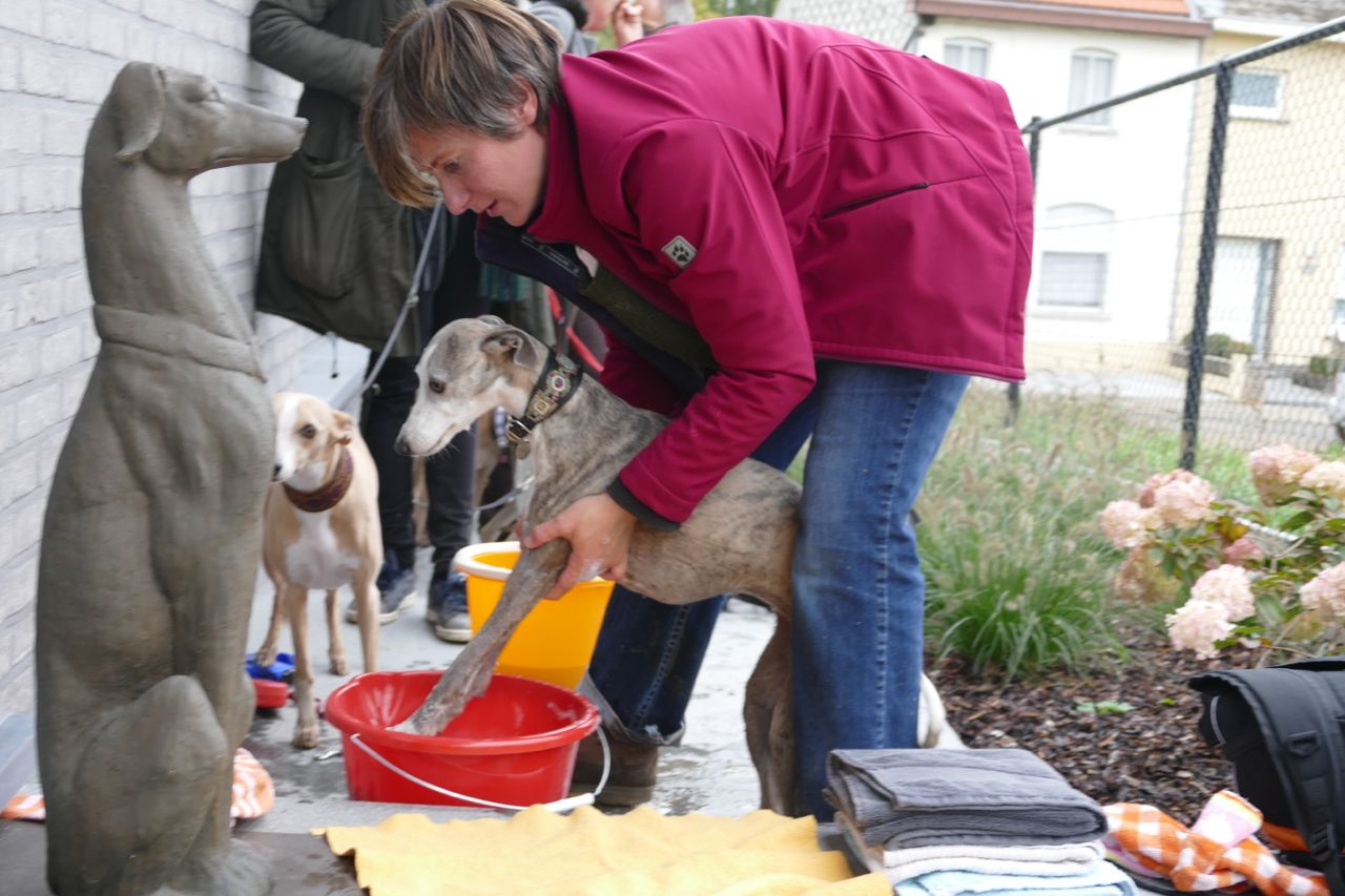 Maar ja…. 16 x 4 = 64 modderpootjes, die mochten mooi niet naar binnen in het fijne, moderne en gloednieuwe huis van Wim en Evelien ;>)). Met frisse tegenzin moesten de hondjes pootje baden in een emmertje sop.