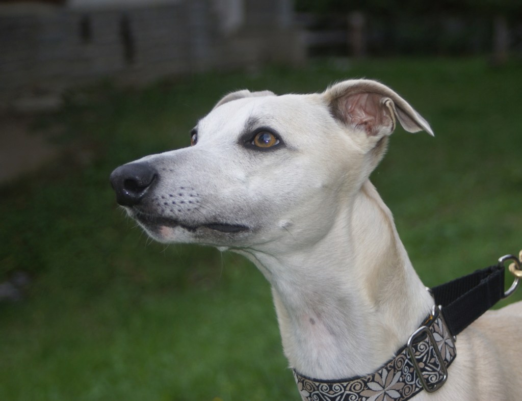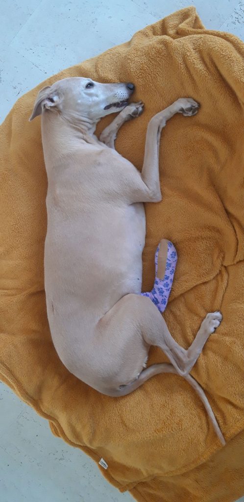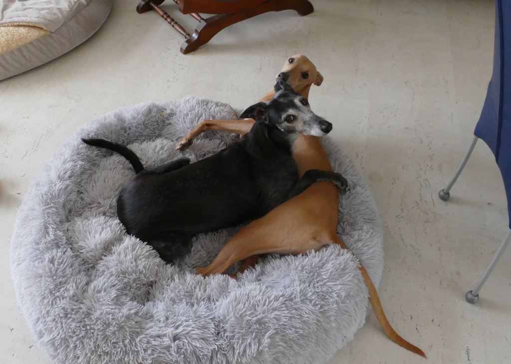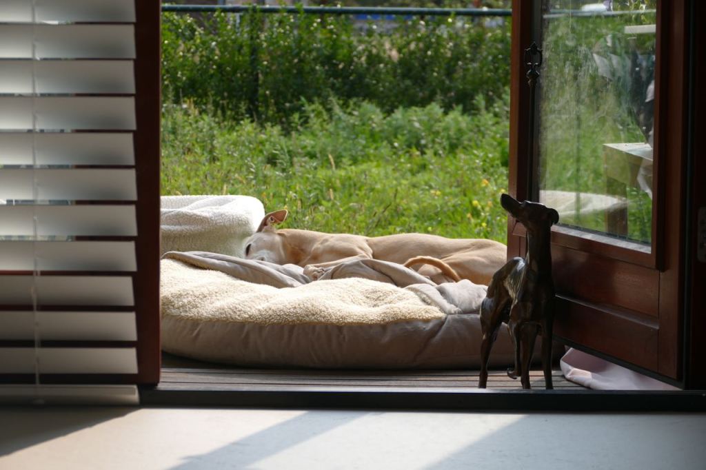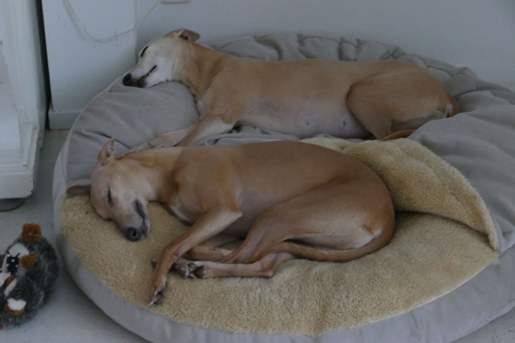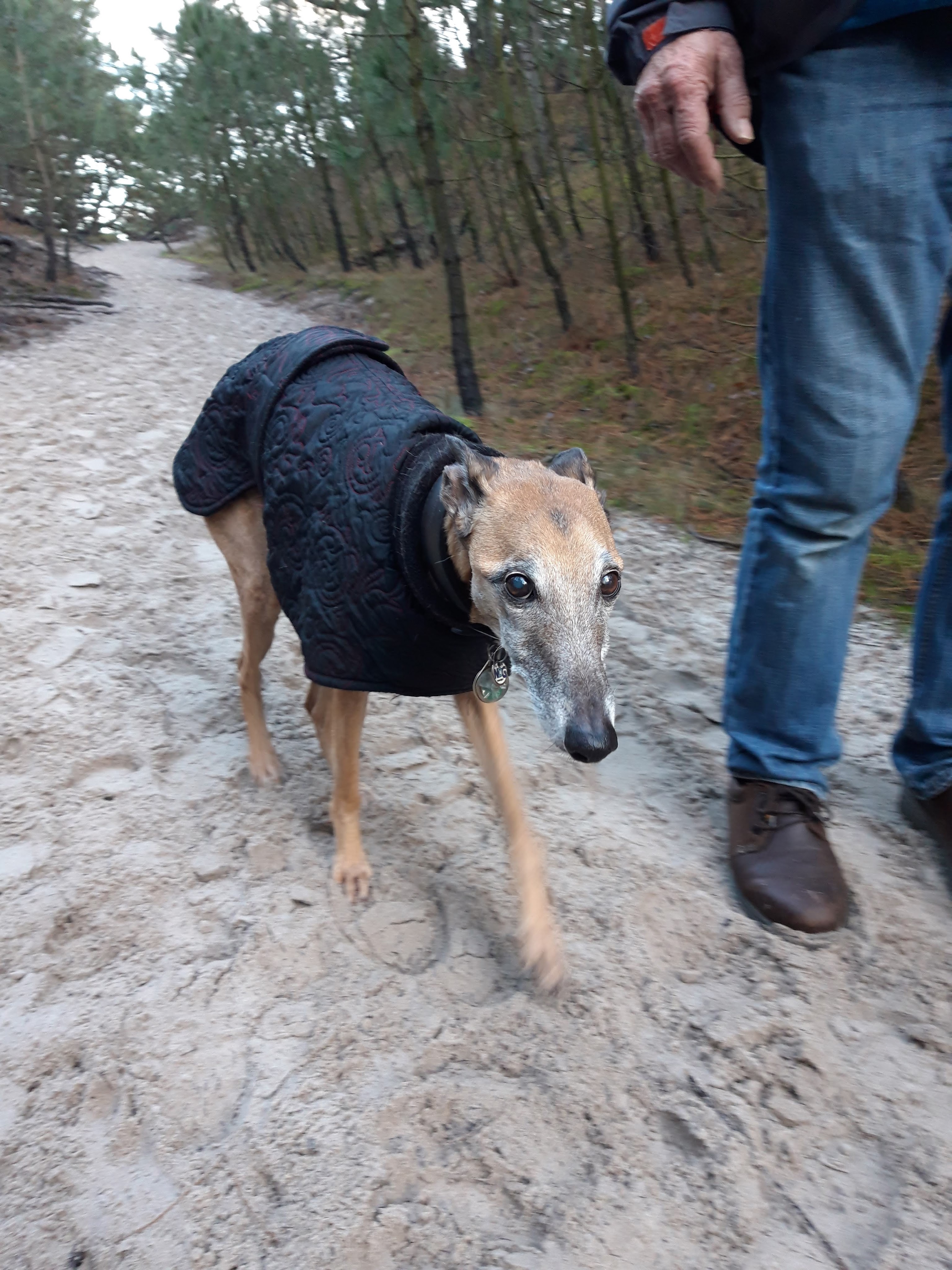 Dit is Whiskey, de oude whippetreu van mijn broer. Hij wordt in maart alweer 16 jaar; hij loopt nog gemakkelijk anderhalf uur mee met mijn roedel, maar zijn drink- en plasgedrag en een echo wezen uit dat zijn nieren erg aan het falen zijn. Hij kwam naast mij wonen samen met mijn broer, en stond regelmatig voor mijn tuindeuren te loeren om bij de andere honden te zijn. Tja, dat kunnen we hem niet kwalijk nemen. Daarom woont hij sinds oktober bij mij in, en zorgen mijn broer en ik samen voor hem in deze laatste fase van zijn lange leven. Leve onze lekkere tuin, en het vinyl op mijn vloer…. de dweil is er iedere ochtend goed voor, maar dat heb ik dik voor Whiskey en mijn lieve broer over.