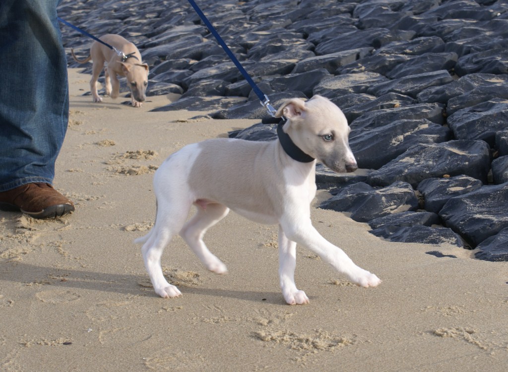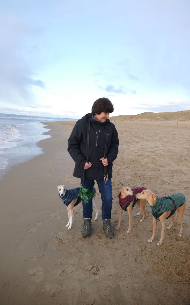 Marianne op het strand met Lotta, Aprille en Megan. De pups kunnen zich verheugen op een opvoeding door hun moeder, oma en overgrootmoeder, het wordt hopelijk weer dik genieten! En betovergrootmoeder Hinde, oudtante Hazel en tante Bliss komen graag af en toe aanwaaien om kennis te maken met hun nieuwste familieleden.