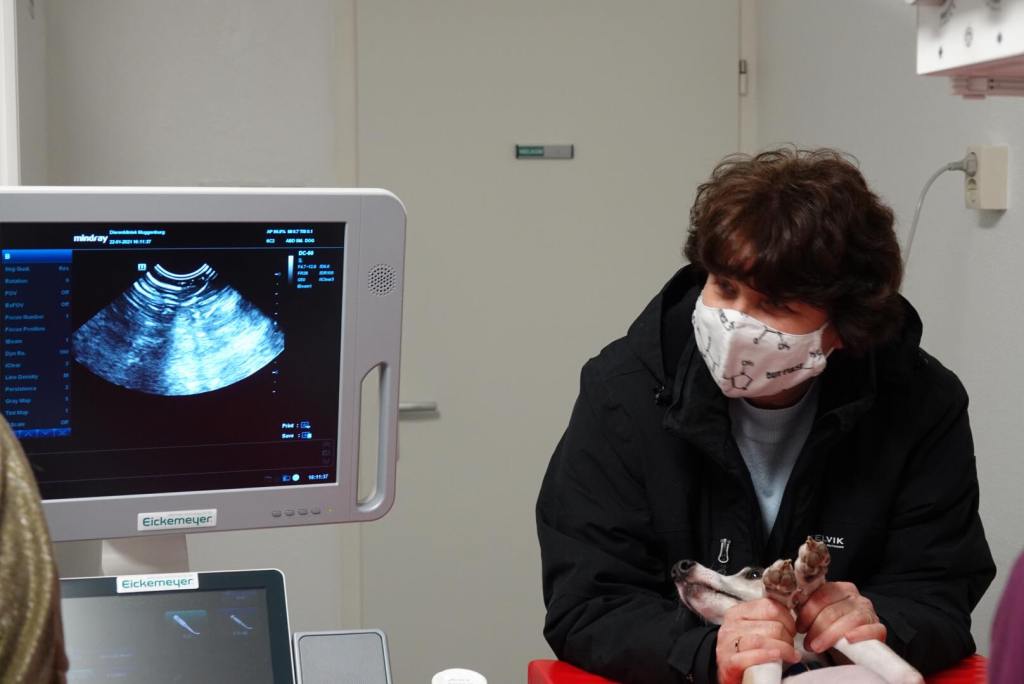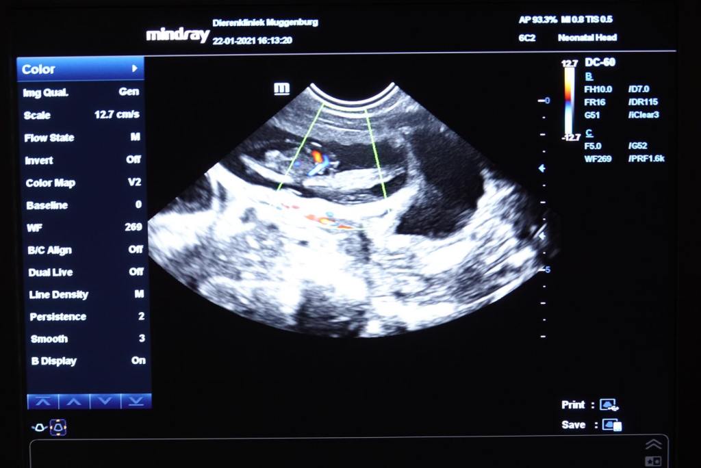 De vruchtjes kwamen al snel in beeld, inclusief hun bloedstroom in kleur. Het blijft magisch om te zien, wat daar allemaal leeft van binnen. Ze werden ook gemeten en waren op dat moment 2,5 cm groot, grote garnalen dus, die in de komende 4 weken moeten uitgroeien naar pups van zo’n 250 – 300 gram.
