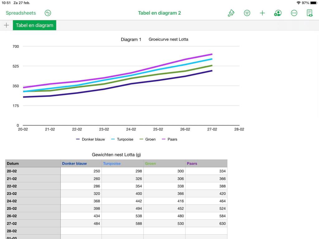 Marianne houdt dagelijks de gewichten bij in een groeitabel; de vier kleurtjes (van de puppybandjes) hebben allemaal een vergelijkbare stijgende lijn. Rond dag acht was het geboortegewicht verdubbeld, en dat is een mooie toename.