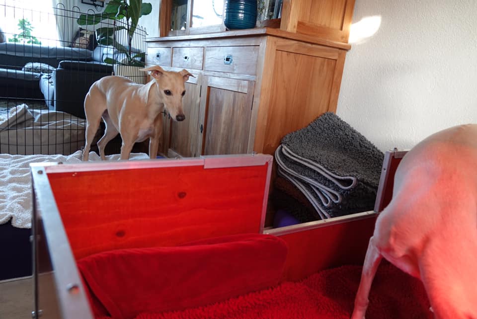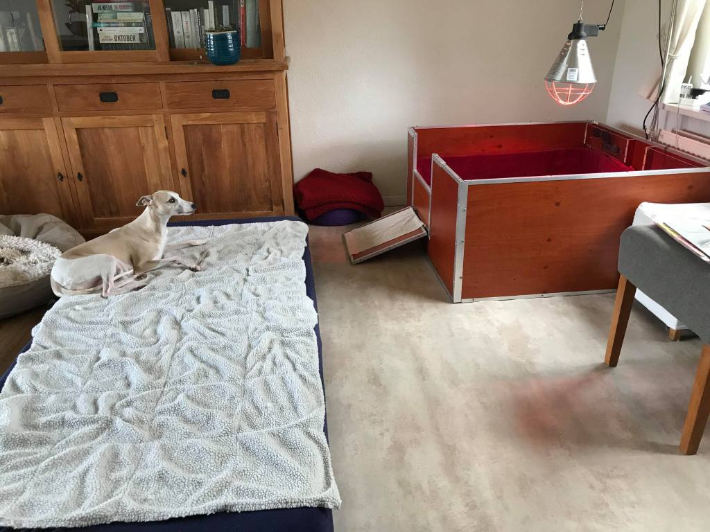 De pups van Lotta zijn vandaag tien dagen oud, en ze zijn dik en rond, en groeien alle vier in een mooi tempo. Lotta is steeds meer op haar gemak, ze wil ook weer korte stukjes wandelen buiten. Maar dan ook weer snel terug. En elke ochtend als Marianne de pupjes weegt houdt ze goed in de gaten wat er met haar kroost gebeurt. De ren die om de werpkist stond is weg want oma Aprille en overgrootmoeder Megan mogen gewoon komen kijken. Ze blijven uit zichzelf op afstand en kijken alleen maar even over de rand heen. Marianne slaapt nog naast de werpkist, maar van slapen komt niet zo veel….. De kreun, piep- en smakgeluidjes die de kleintjes maken zijn steeds luider. Dus Marianne hoopt eerdaags naar haar eigen bed te kunnen verhuizen.