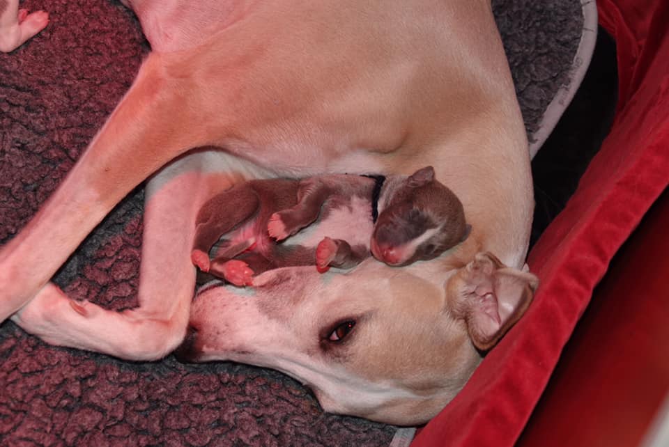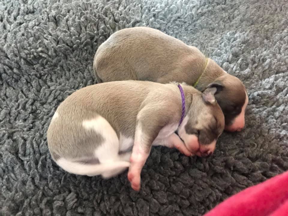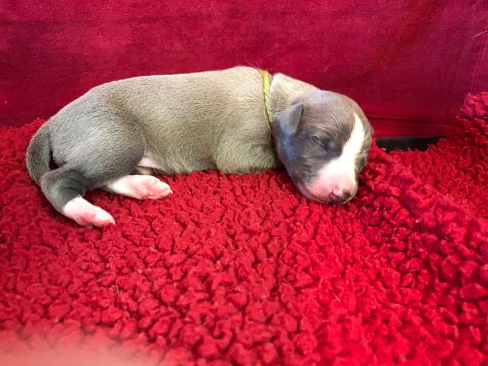 Op deze foto uit 2017, van Lotta, toen drie dagen oud, is goed te zien dat ook zij destijds het blauwige kleurtje had dat haar pups nu hebben.