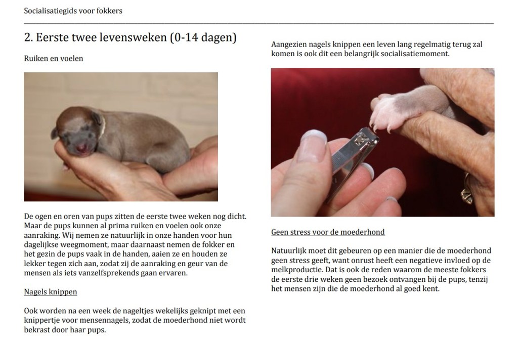 Marianne en ik hebben ooit een digitale socialisatiegids geschreven waarin staat welke socialisatiemomenten fokkers kunnen inpassen in de eerste acht levensweken van hun nest. De gids is in te zien via het menu van dit blog. Op de bovenstaande pagina’s is te lezen wat er op socialisatiegebied gebeurt in de eerste twee levensweken. Het lijkt niet zo veel, maar als deze handelingen met liefde en beleid gebeuren, dan wordt een goede basis gelegd voor pups die later zelfzeker in het leven zullen staan.