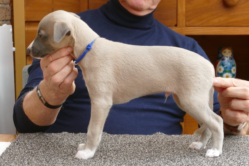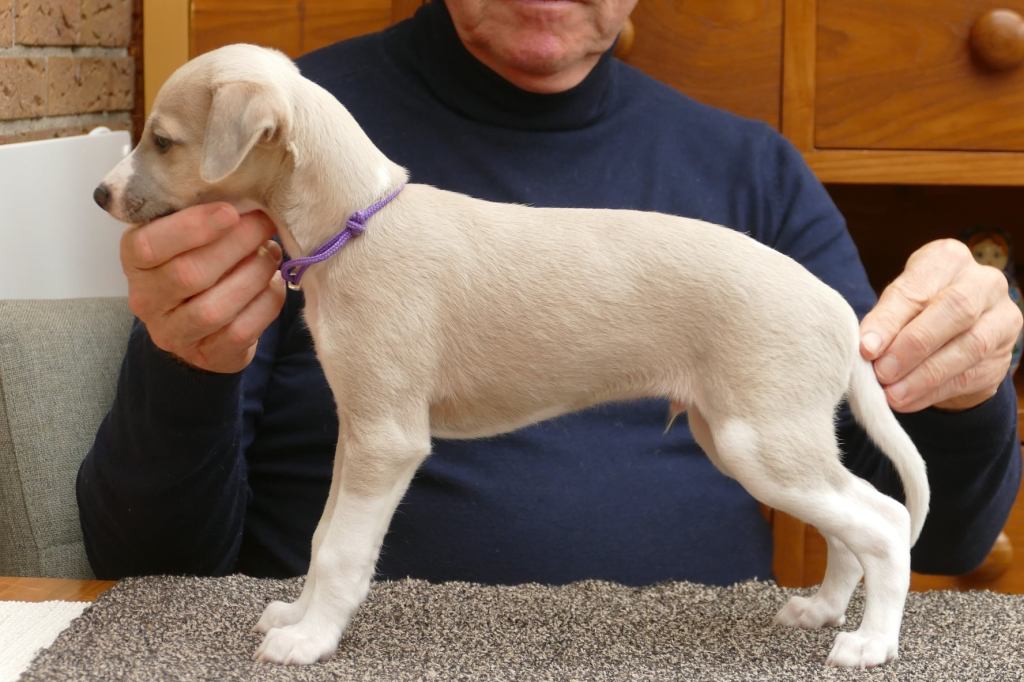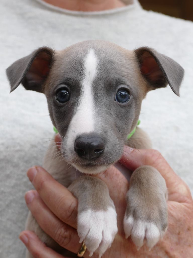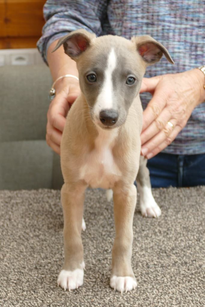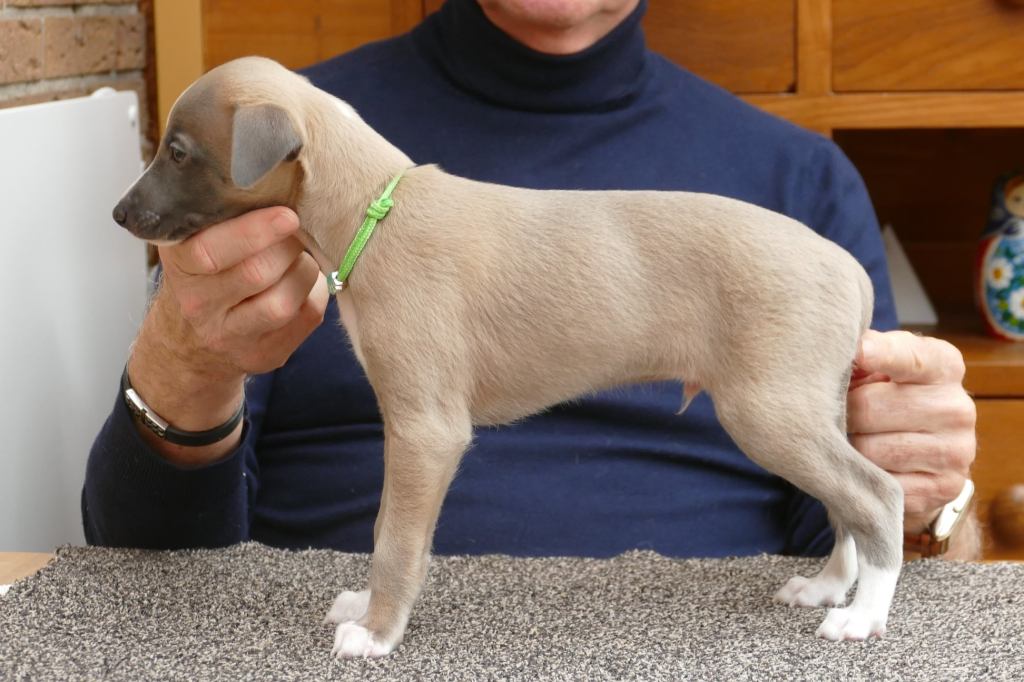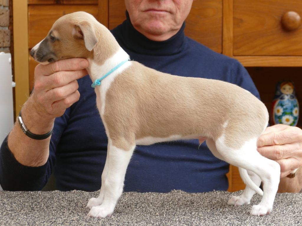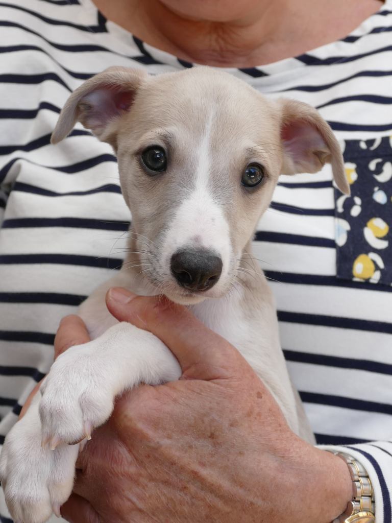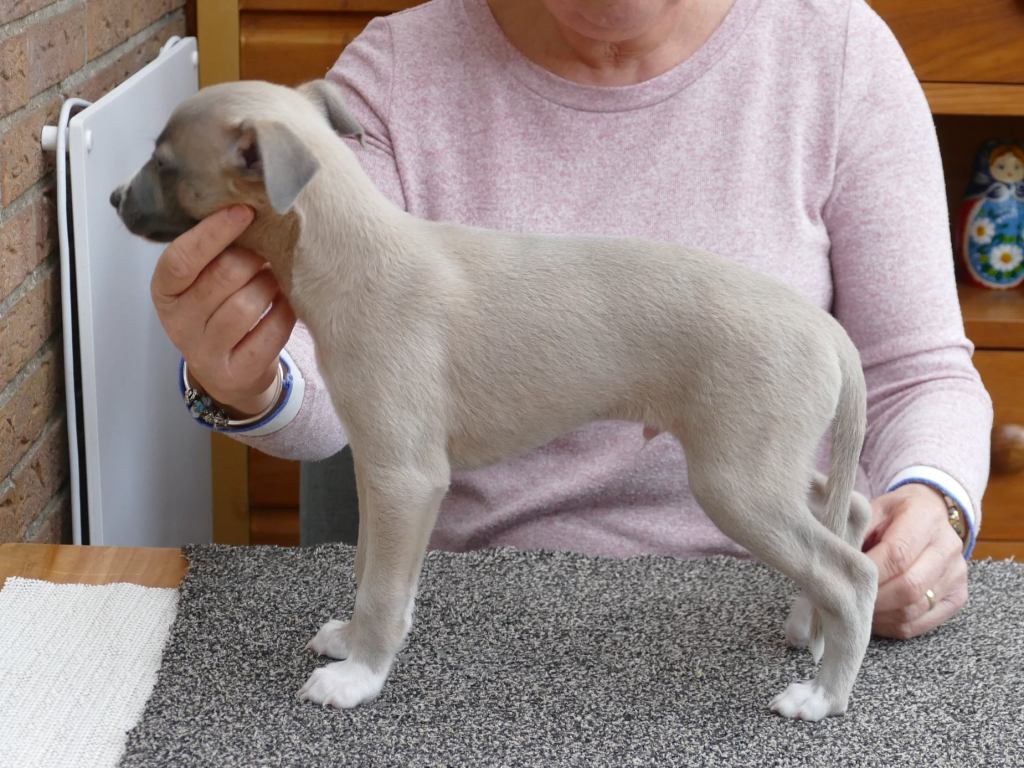 Fraaie Oida, voor de raskenners de fraaist gebouwde van het nest. Een ondernemende doener ten opzichte van zijn nestgenoten, die in zijn eentje toch een toontje lager blijkt te zingen. Hij gaat bij wonen bij whippet Flits, die voor deze uitgelaten jongen een stabiele oudere broer zal zijn.