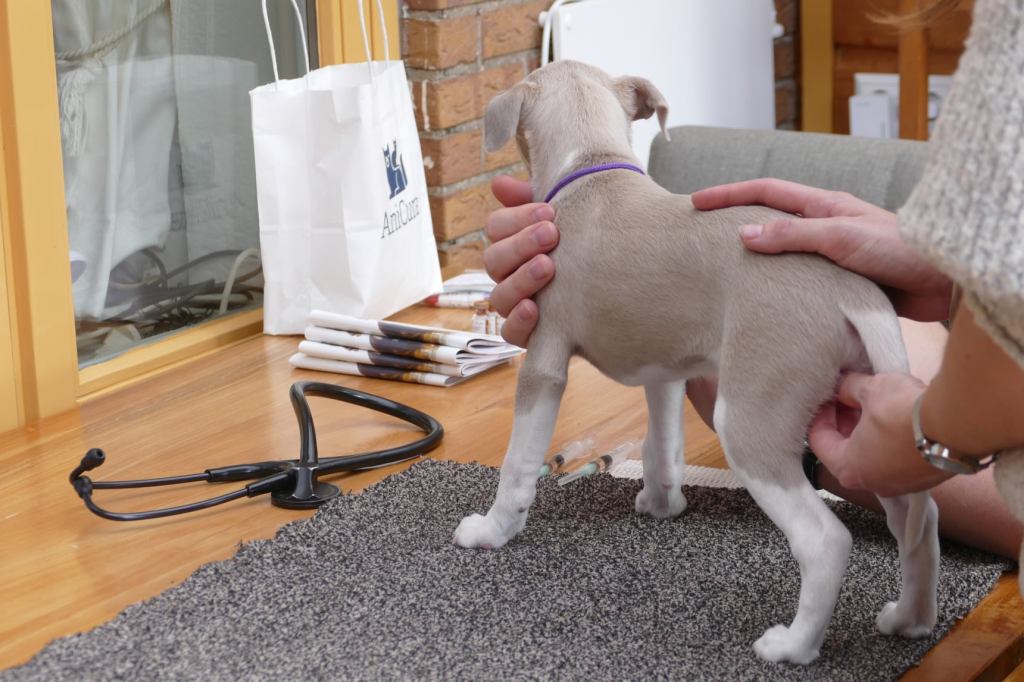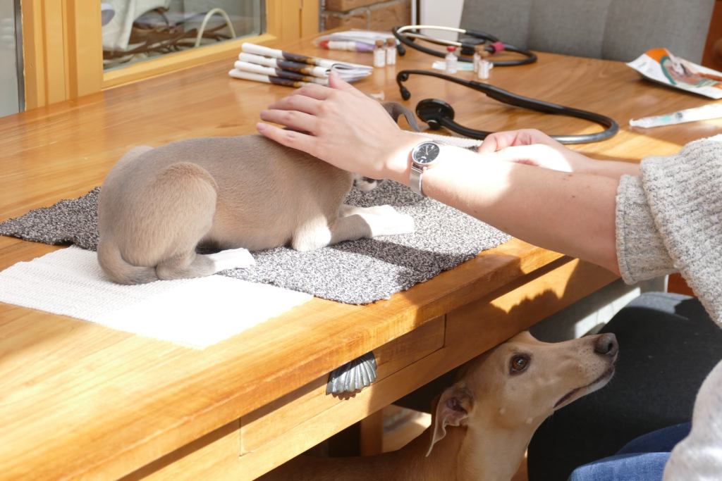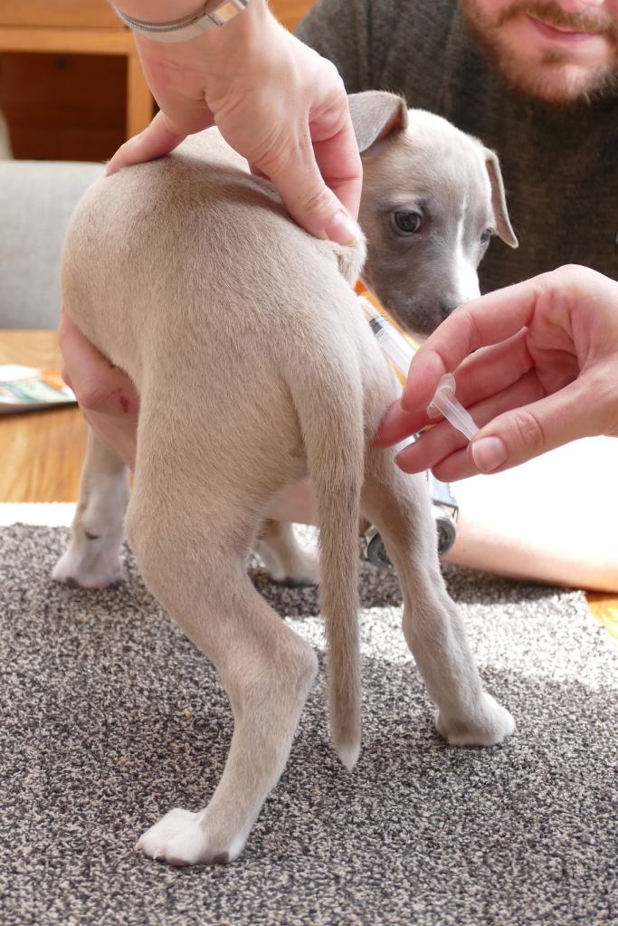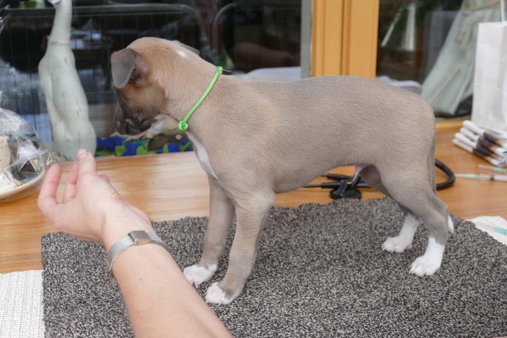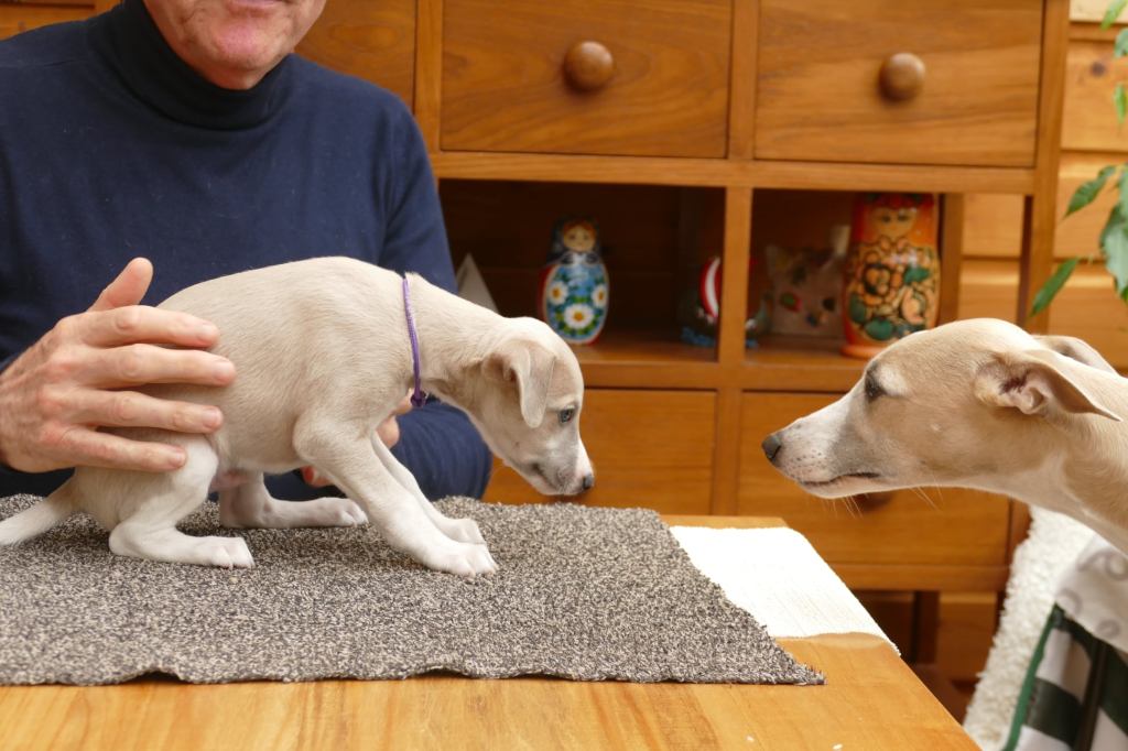 Er werd nog heel wat afgespeeld door het viertal, in hun laatste week samen. Ook zijn ze nog een aantal keren mee geweest in de auto. Jutter heeft een wandelingetje kunnen maken met zijn nieuwe maatje Joppe. Alle vier zijn gechipt door de Raad van Beheer, en net als bij de vaccinaties gaven ze geen kik, zo stoer! En ik heb de laatste hand gelegd aan onze pupinformatie voor de eigenaren, o.a. door er foto’s en gegevens van het nest en hun ouders en voorouders in op te nemen. Alweer voor het zesde nest in 17 jaar tijd, iedere keer weer een kleine update en revisie om de informatie persoonlijker te maken.