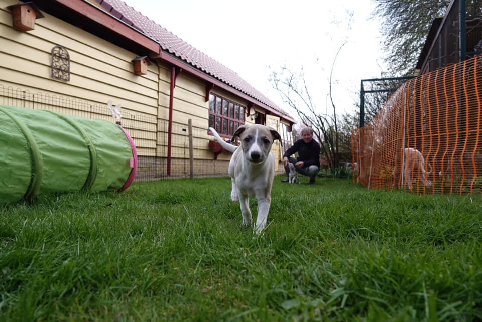 Floyd (voorheen Groentje) in de tuin bij Marianne en Arend. Wat een geluk dat het weer het de afgelopen weken toestond om de pups heerlijk buiten te laten rennen en spelen.